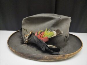 For our current display, student interns Briana Pepe and Tarah Sailam designed and researched the exhibit and unboxed a unique assortment of hats from our textile collection. While the centerpiece is the hat worn by Percy Lovell, there are Stetson hats, a Quaker bonnet, and “fashionable” hats with beads and feathers, each telling a part of the story of fashion in Moorestown throughout the years. So ‘head’ over to Smith-Cadbury Mansion where they can be seen in the 2nd floor bedroom display case.
