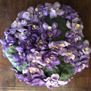 Hats covered in flowers were popularized briefly by Queen Elizabeth II in 1954, when she wore one for her coronation. At the time, the color purple was very popular in teen and young women’s fashion. This hat, donated by Mrs Maurice Collins, was most likely worn in the 1950s.